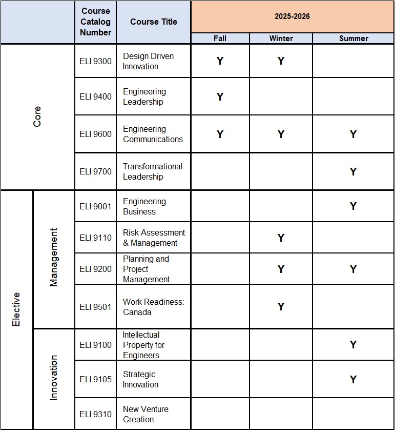 Once completed, students receive both the MEng degree and the Graduate Diploma in Engineering Leadership and Innovation. Students registered in any technical field of the MEng program in the Faculty of Engineering may select this option.