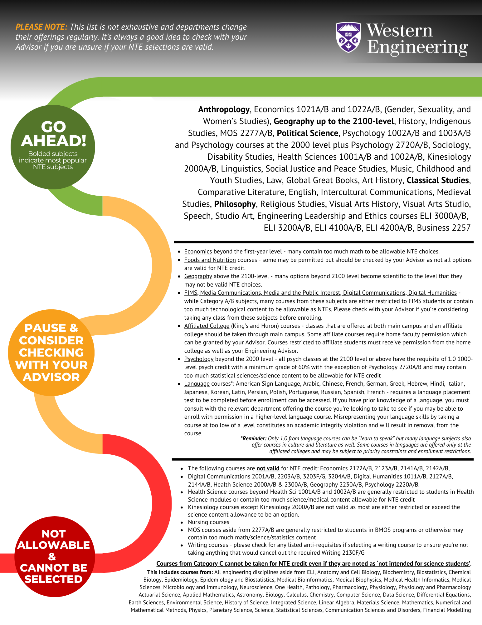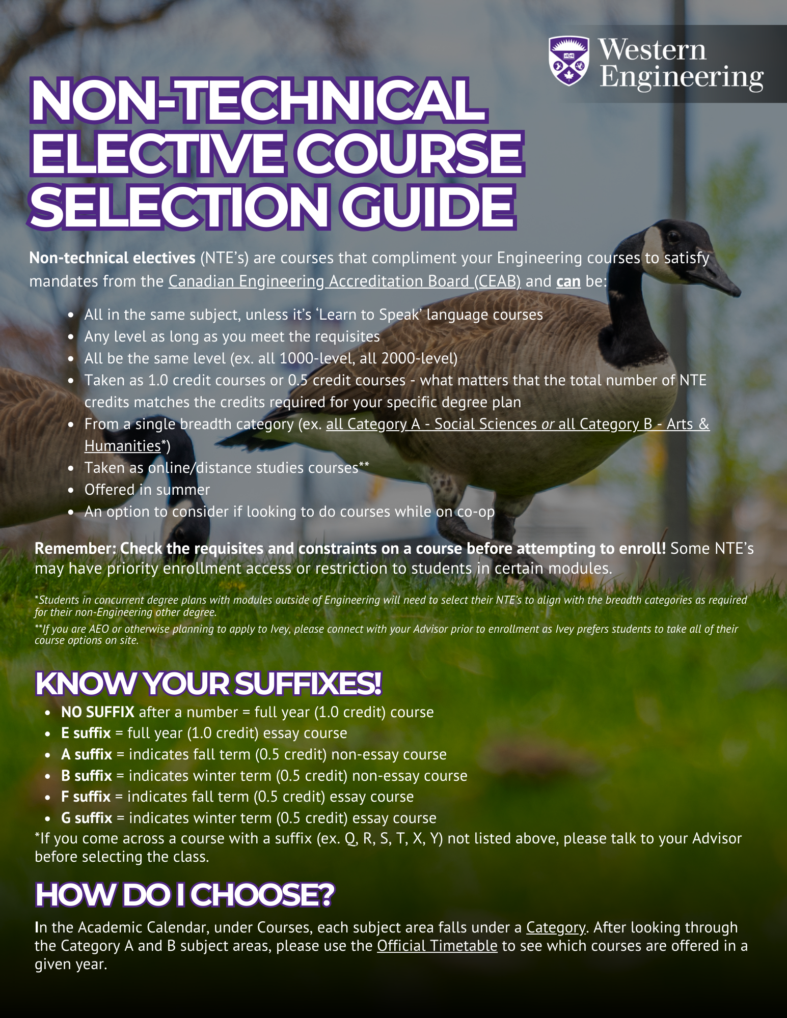 Non-technical electives (NTE's) are courses that complement your Engineering courses in order to satisfy mandates from the Canadian Engineering Accreditation Board (CEAB). You can choose your NTEs from courses designated as Category A (Social Science) or Category B (Arts & Humanities), as defined in Western’s Academic Calendar.
