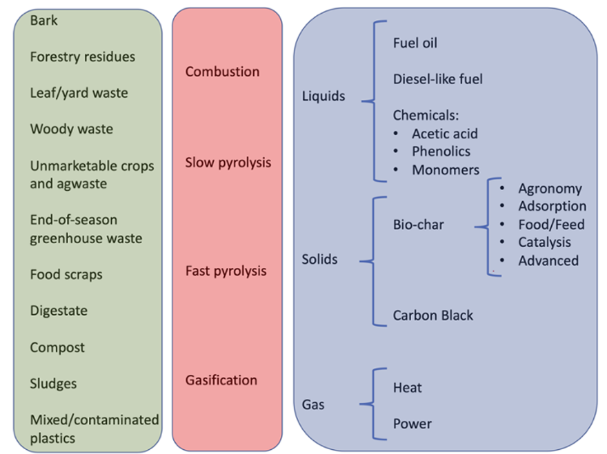 The NSERC Industrial Research Chair in Thermochemical Conversion of Biomass and Waste to Bioindustrial Resources has a research program that covers the spectrum of feedstock (green fill), thermochemical conversion processes (pink fill) and applications/market uptake (blue fill) of the products of conversion. All of the partners to the program have vested interest in a least one of these areas, and typically ech partner's interest spans two or three of the segments of this continuum. As such, there is a great deal of synergy and cooperation which simplifies research priority establishment and enables accelerated research outcomes. Please refer to current projects for more details.