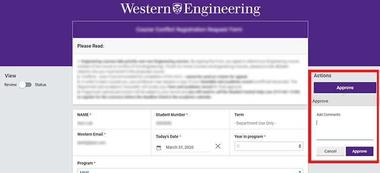 - If you want to send this form back to the submitter to fix something, you can click on "Send Back" button with adding a comment. After submitter fix/update the form and re-submit, you will get another email to approve.