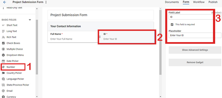 - Then you can add a name, placeholder and check the checkbox for this number field.