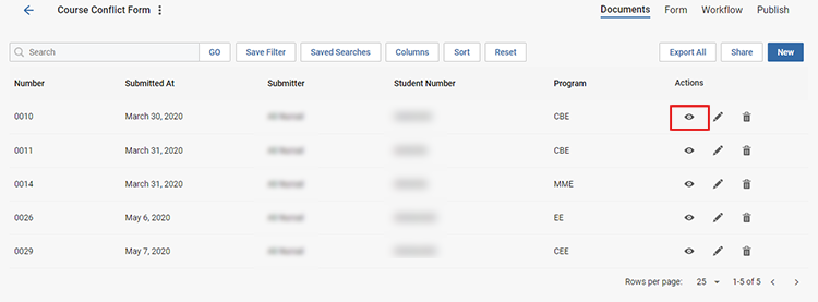- You can view or edit the status of each form submission by clicking the eye or pencil icon.