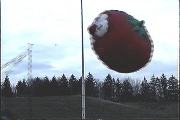 Tomato-shaped inflatable immediately before impact on the instrumented test post