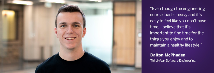 I play intramural hockey and soccer every week. It’s a great way to take my mind off school work for an hour while getting exercise. Leading up to university, I always played sports and was worried that I might not have the time anymore. Even though the engineering course load is heavy and it’s easy to feel like you don’t have time, I believe that it’s important to find time for the things you enjoy and to maintain a healthy lifestyle.