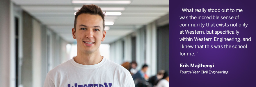 When I attended Western Engineering’s Fall Preview Day as a high school student, it left such an exceptional impression on me. What really stood out to me was the incredible sense of community that exists not only at Western, but specifically within Western Engineering, and I knew that this was the school for me. There really is a sense of family among all the students and every new member of the family feels immediately welcomed. This feeling of community also extends to the staff, as there is a wide variety of support available and professors are always willing to help. As well, Western has a very strong and reputable engineering department, specifically in civil engineering. I was also attracted to the co-op and internship program that Western offers, where students have the option to enhance their learning with a work term before graduation.