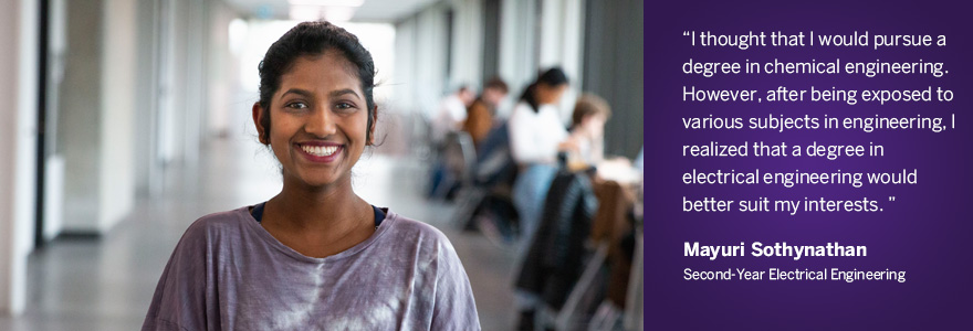 In high school, I loved learning about maths and sciences. I felt that engineering was a field in which I could apply my knowledge in these subjects to creatively solve real-world problems. I chose Western because of the strong sense of community and the general first year. When I entered first year, I thought that I would pursue a degree in chemical engineering. However, after being exposed to various subjects in engineering, I realized that a degree in electrical engineering would better suit my interests.
