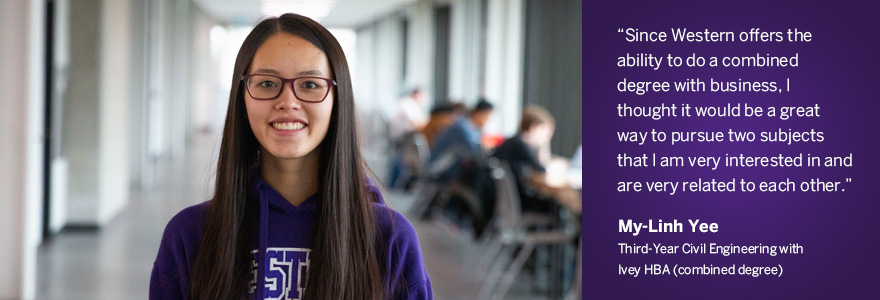 Before coming to Western I had never taken any business courses, but in first year I was required to take a Business for Engineers course. The course was run by the pre-Ivey faculty here at Western and structured very similarly to Ivey classes. I found that I really enjoyed the first-year business course and it had great applicability to engineering. Since Western offers the ability to do a dual degree with business, I thought it would be a great way to pursue two subjects that I am very interested in and are very related to each other.